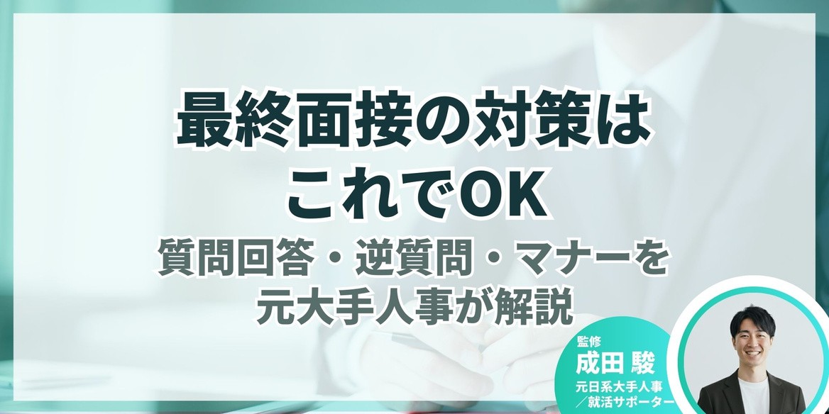 今回は、元日系大手人事で、キャリアアドバイザーとして延べ3,000名以上の学生を支援してきた成田さんの知見をもとに、質問対策・逆質問・マナー・事前準備・面接後の対応まで、最終面接に必要な対策を一通りまとめています。