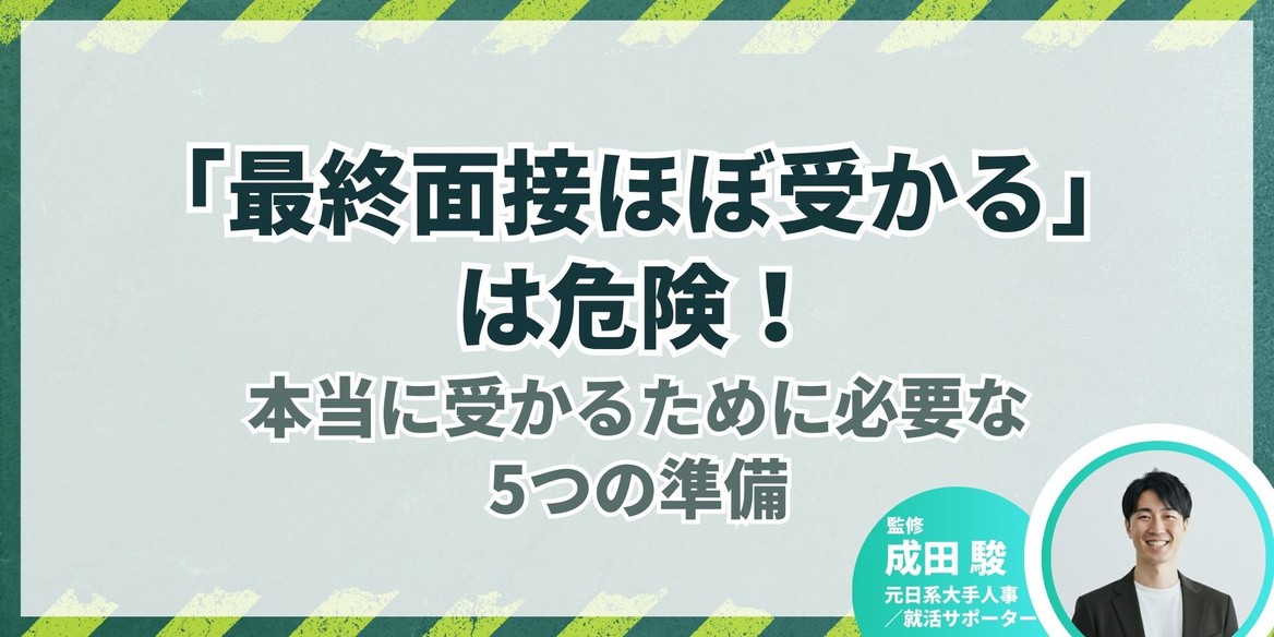 今回は、元日系大手人事で、キャリアアドバイザーとして延べ3,000名以上の学生を支援してきた成田さんの知見をもとに、「ほぼ受かる」状態を本当に作る5つの準備と、合格率を落とさないための注意点を解説します。正しい対策を知れば、最終面接を自信を持って迎えられます。
