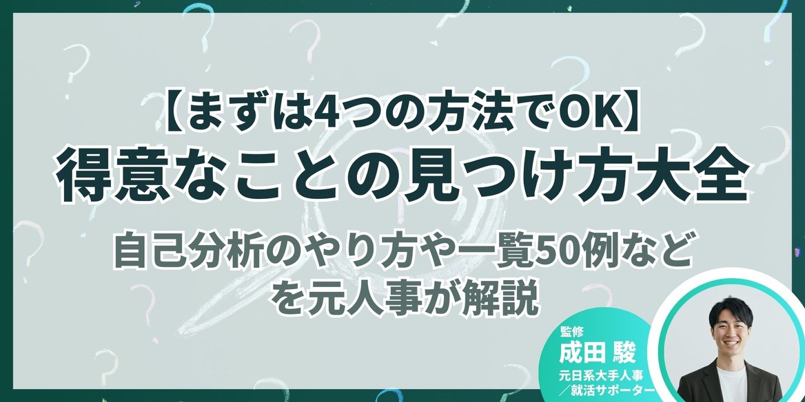 今回は、元日系大手人事で、キャリアアドバイザーとして延べ3,000名以上の学生を支援してきた成田さんの知見をもとに、まずは試したい4つのおすすめの方法を中心に、得意なことの見つけ方を詳しく解説します。一覧50選やES・面接での答え方も紹介しているので、ぜひ参考にしてください。