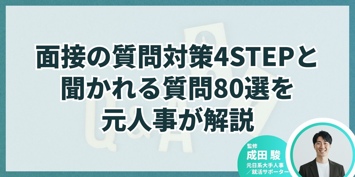 そこで本記事では、元日系大手人事で、キャリアアドバイザーとして延べ3,000名以上の学生を支援してきた成田さんの経験をもとに、面接で聞かれる質問80選と各質問への回答のコツを解説。また、対策の進め方を4ステップで整理し、あらゆる質問に対応するための自己分析・業界/企業研究の方法から、逆質問・マナー、練習方法まで網羅してご紹介します。