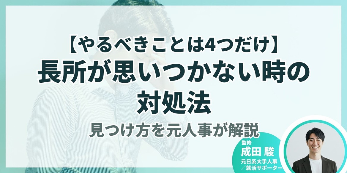 今回は、元日系大手人事で、キャリアアドバイザーとして延べ3,000名以上の学生を支援してきた成田さんの知見をもとに、長所が思いつかない原因と、まずやるべきこと1つ、おすすめの見つけ方3選、伝え方のコツや例文まで解説します。