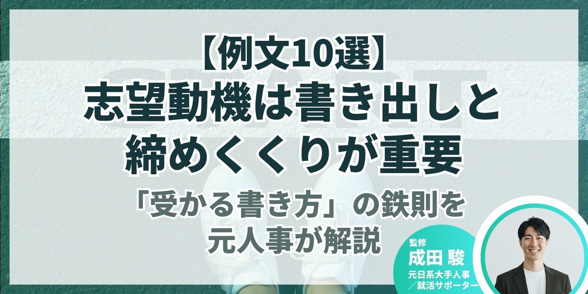 そこで今回は、元日系大手人事で、キャリアアドバイザーとして延べ3,000名以上の学生を支援してきた成田さんの経験をもとに、受かる志望動機の考え方や構成の型を解説します。書き出し・締めくくりを作る際のポイントに加え、社風・理念・事業内容別に使える例文も紹介します。