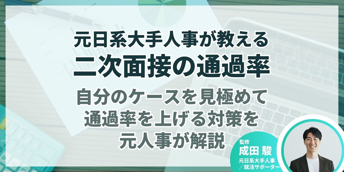 本記事では、元日系大手人事で、キャリアアドバイザーとして延べ3,000名以上の学生を支援してきた成田さんの監修のもと、二次面接の通過率の実態と、通過率を上げるための対策を解説します。