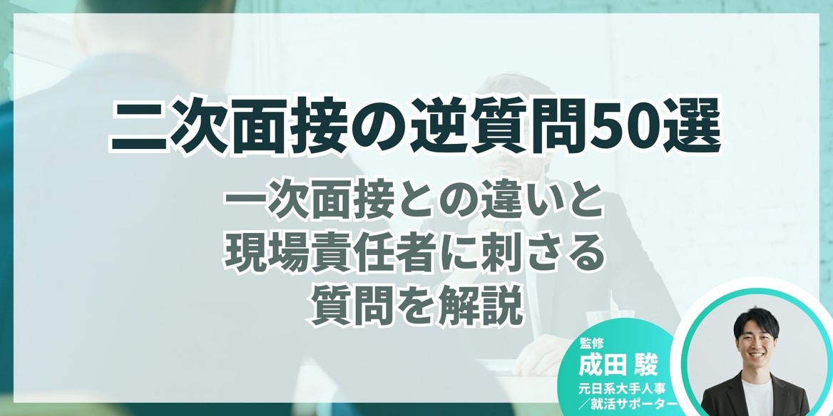 今回は、元日系大手人事で、キャリアアドバイザーとして延べ3,000名以上の学生を支援してきた成田さんの監修のもと、二次面接で評価される逆質問50選と、オリジナル質問を作る7つの公式、評価を稼ぐコツを解説します。